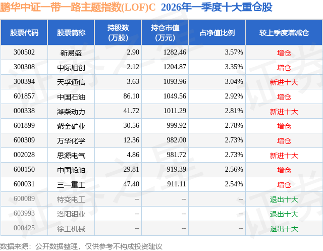 从基金规模来看,鹏华中证一带一路主题指数(LOF)C基金2026年一季度公布的基金规模为0.88亿元,较上一期规模1104.26万元变化了7731.92万元,环比变化了700.19%。该基金最新一期资产配置为:股票占净值比94.89%,无债券类资产,现金占净值比5.85%。从基金持仓来看,该基金当季前十大股票仓位达29.03%,第一大重仓股为新易盛(300502),持仓占比为3.57%。