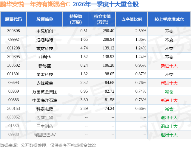 从基金规模来看,鹏华安悦一年持有期混合C基金2026年一季度公布的基金规模为0.04亿元,较上一期规模321.96万元变化了32.79万元,环比变化了10.19%。该基金最新一期资产配置为:股票占净值比16.48%,债券占净值比77.75%,现金占净值比3.62%。从基金持仓来看,该基金当季前十大股票仓位达11.64%,第一大重仓股为中际旭创(300308),持仓占比为2.59%。