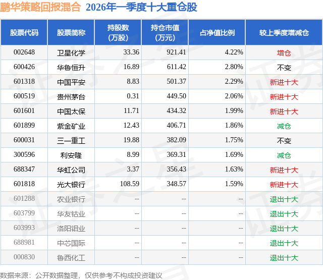 从基金规模来看,鹏华策略回报混合基金2026年一季度公布的基金规模为2.19亿元,较上一期规模2.97亿元变化了-7825.16万元,环比变化了-26.36%。该基金最新一期资产配置为:股票占净值比84.03%,债券占净值比0.01%,现金占净值比15.27%。从基金持仓来看,该基金当季前十大股票仓位达21.88%,第一大重仓股为卫星化学(002648),持仓占比为4.22%。