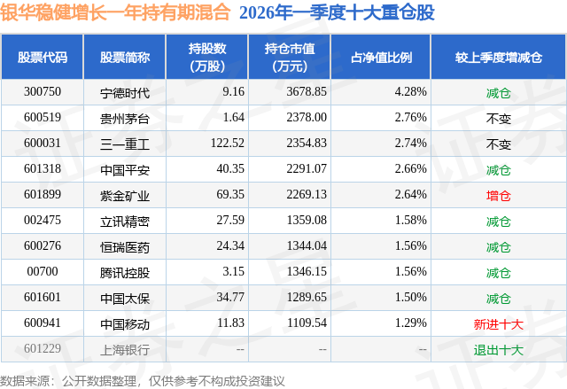 证券之星消息,日前银华稳健增长一年持有期混合基金公布一季报,2026年一季度最新规模8.6亿元,季度净值涨幅为-2.89%。