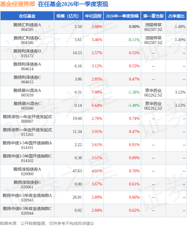 证券之星消息,日前鹏扬景兴混合C基金公布一季报,2026年一季度最新规模0.14亿元,季度净值涨幅为-1.48%。