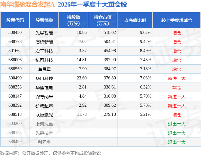从基金规模来看,南华瑞盈混合发起A基金2026年一季度公布的基金规模为0.06亿元,较上一期规模3.23亿元变化了-3.16亿元,环比变化了-98.07%。该基金最新一期资产配置为:股票占净值比82.05%,无债券类资产,现金占净值比18.43%。从基金持仓来看,该基金当季前十大股票仓位达72.32%,第一大重仓股为先导智能(300450),持仓占比为9.67%。