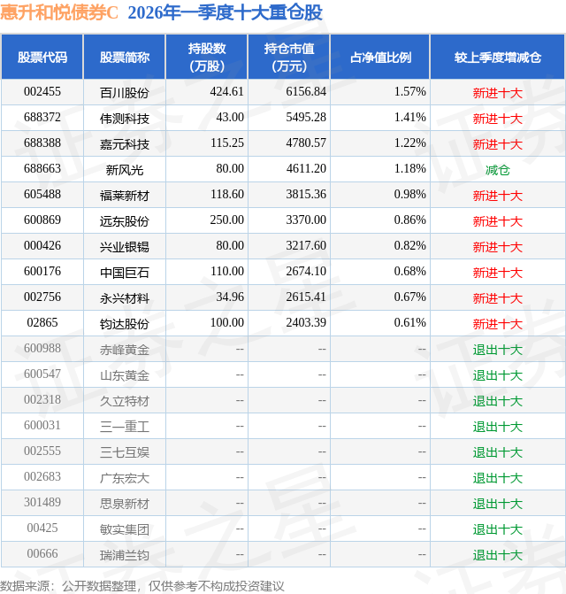 从基金规模来看,惠升和悦债券C基金2026年一季度公布的基金规模为0.09亿元,较上一期规模12.34万元变化了851.11万元,环比变化了6899.22%。该基金最新一期资产配置为:股票占净值比15.82%,债券占净值比89.23%,现金占净值比7.45%。从基金持仓来看,该基金当季前十大股票仓位达10.0%,第一大重仓股为百川股份(002455),持仓占比为1.57%。
