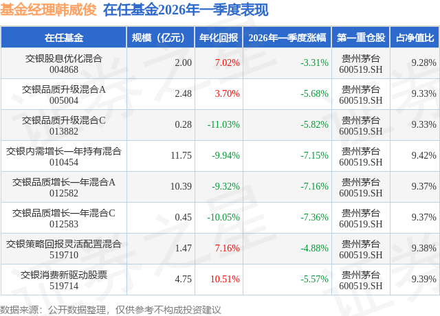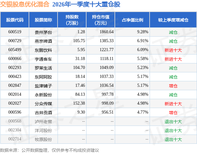 从基金规模来看,交银股息优化混合基金2026年一季度公布的基金规模为2.0亿元,较上一期规模4.49亿元变化了-2.49亿元,环比变化了-55.36%。该基金最新一期资产配置为:股票占净值比92.45%,无债券类资产,现金占净值比7.08%。从基金持仓来看,该基金当季前十大股票仓位达58.16%,第一大重仓股为贵州茅台(600519),持仓占比为9.28%。