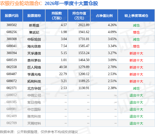 从基金规模来看,农银行业轮动混合C基金2026年一季度公布的基金规模为0.08亿元,较上一期规模522.24万元变化了303.15万元,环比变化了58.05%。该基金最新一期资产配置为:股票占净值比90.19%,无债券类资产,现金占净值比10.23%。从基金持仓来看,该基金当季前十大股票仓位达31.82%,第一大重仓股为新易盛(300502),持仓占比为4.26%。