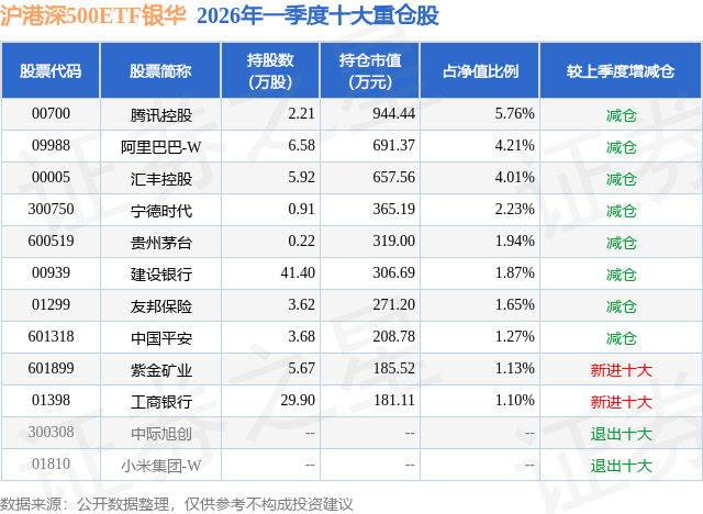 证券之星消息,日前沪港深500ETF银华基金公布一季报,2026年一季度最新规模1.64亿元,季度净值涨幅为-4.56%。