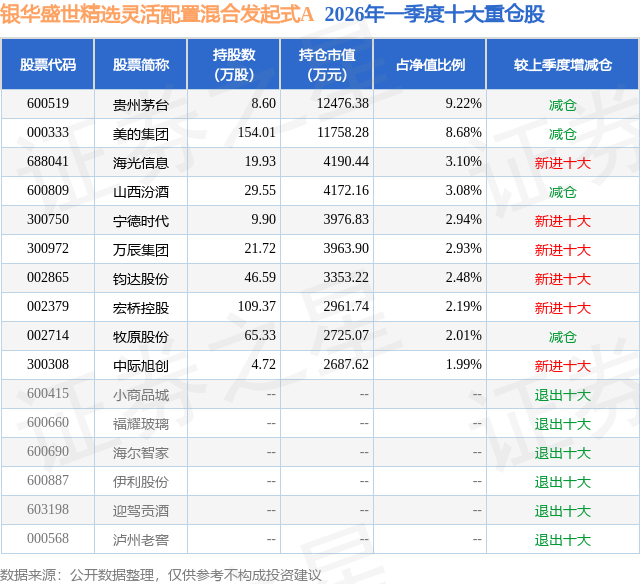 从基金规模来看,银华盛世精选灵活配置混合发起式A基金2026年一季度公布的基金规模为13.46亿元,较上一期规模23.5亿元变化了-10.03亿元,环比变化了-42.7%。该基金最新一期资产配置为:股票占净值比87.85%,无债券类资产,现金占净值比12.85%。从基金持仓来看,该基金当季前十大股票仓位达38.62%,第一大重仓股为贵州茅台(600519),持仓占比为9.22%。