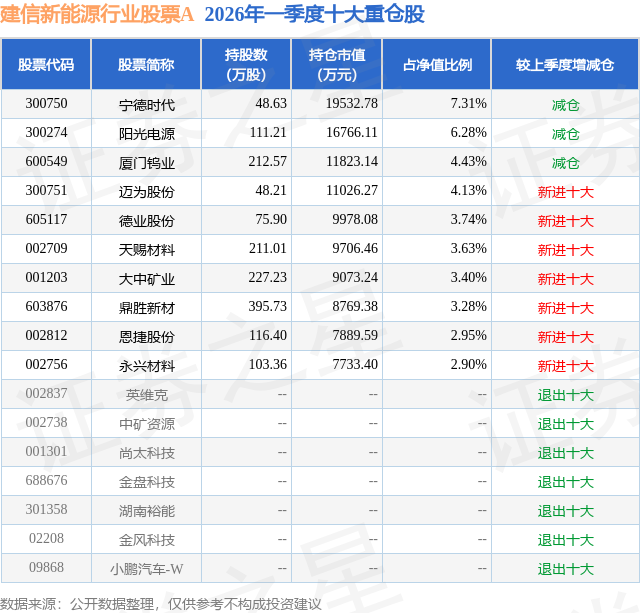 从基金规模来看,建信新能源行业股票A基金2026年一季度公布的基金规模为22.46亿元,较上一期规模27.04亿元变化了-4.58亿元,环比变化了-16.92%。该基金最新一期资产配置为:股票占净值比91.93%,债券占净值比0.76%,现金占净值比7.94%。从基金持仓来看,该基金当季前十大股票仓位达42.05%,第一大重仓股为宁德时代(300750),持仓占比为7.31%。