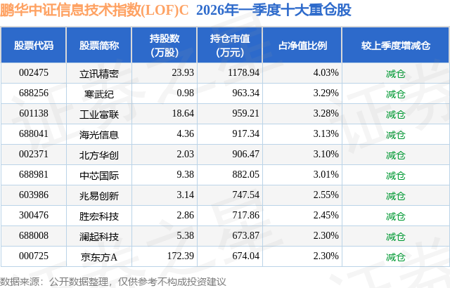 从基金规模来看,鹏华中证信息技术指数(LOF)C基金2026年一季度公布的基金规模为0.14亿元,较上一期规模1302.91万元变化了128.96万元,环比变化了9.9%。该基金最新一期资产配置为:股票占净值比93.94%,无债券类资产,现金占净值比5.73%。从基金持仓来看,该基金当季前十大股票仓位达29.44%,第一大重仓股为立讯精密(002475),持仓占比为4.03%。
