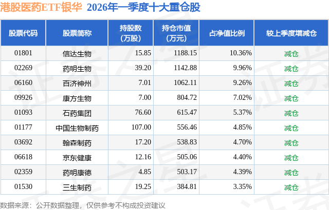 从基金规模来看,港股医药ETF银华基金2026年一季度公布的基金规模为1.15亿元,较上一期规模1.2亿元变化了-482.93万元,环比变化了-4.04%。该基金最新一期资产配置为:股票占净值比98.11%,无债券类资产,现金占净值比2.15%。从基金持仓来看,该基金当季前十大股票仓位达63.66%,第一大重仓股为信达生物(01801),持仓占比为10.36%。