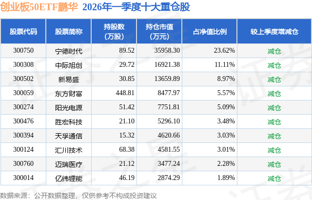 从基金规模来看,创业板50ETF鹏华基金2026年一季度公布的基金规模为15.23亿元,较上一期规模21.43亿元变化了-6.21亿元,环比变化了-28.96%。该基金最新一期资产配置为:股票占净值比98.77%,无债券类资产,现金占净值比3.31%。从基金持仓来看,该基金当季前十大股票仓位达68.05%,第一大重仓股为宁德时代(300750),持仓占比为23.62%。