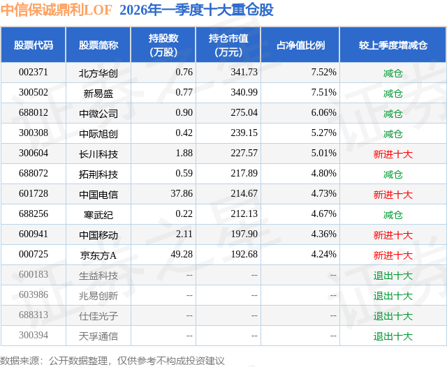 从基金规模来看,中信保诚鼎利LOF基金2026年一季度公布的基金规模为0.4亿元,较上一期规模3778.84万元变化了208.0万元,环比变化了5.5%。该基金最新一期资产配置为:股票占净值比77.63%,无债券类资产,现金占净值比21.38%。从基金持仓来看,该基金当季前十大股票仓位达54.17%,第一大重仓股为北方华创(002371),持仓占比为7.52%。