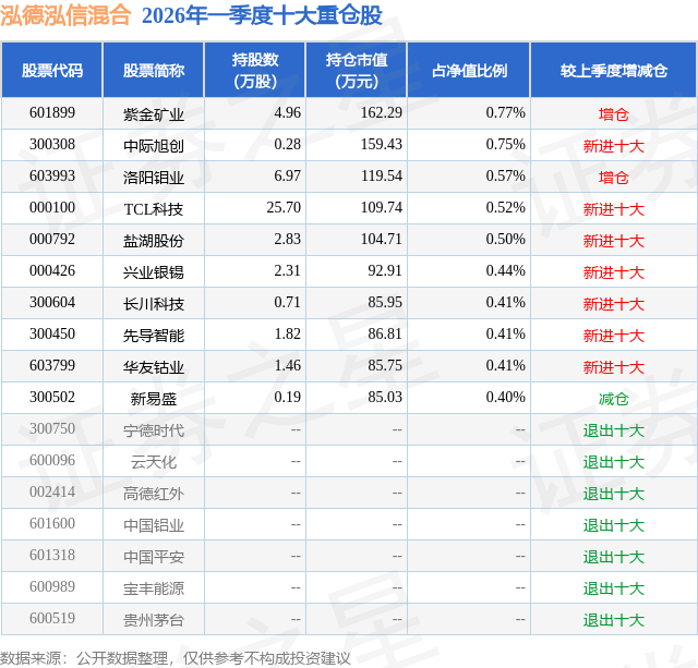 从基金规模来看,泓德泓信混合基金2026年一季度公布的基金规模为2.11亿元,较上一期规模1.59亿元变化了5198.64万元,环比变化了32.66%。该基金最新一期资产配置为:股票占净值比92.97%,无债券类资产,现金占净值比6.99%。从基金持仓来看,该基金当季前十大股票仓位达5.18%,第一大重仓股为紫金矿业(601899),持仓占比为0.77%。