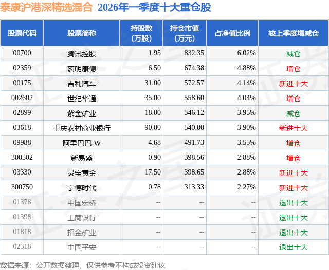 从基金规模来看,泰康沪港深精选混合基金2026年一季度公布的基金规模为1.38亿元,较上一期规模1.01亿元变化了3733.86万元,环比变化了36.97%。该基金最新一期资产配置为:股票占净值比83.56%,无债券类资产,现金占净值比9.29%。从基金持仓来看,该基金当季前十大股票仓位达38.51%,第一大重仓股为腾讯控股(00700),持仓占比为6.02%。