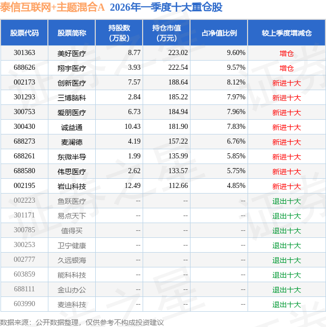 从基金规模来看,泰信互联网+主题混合A基金2026年一季度公布的基金规模为0.06亿元,较上一期规模7017.82万元变化了-6445.64万元,环比变化了-91.85%。该基金最新一期资产配置为:股票占净值比91.74%,无债券类资产,现金占净值比7.87%。从基金持仓来看,该基金当季前十大股票仓位达74.26%,第一大重仓股为美好医疗(301363),持仓占比为9.6%。