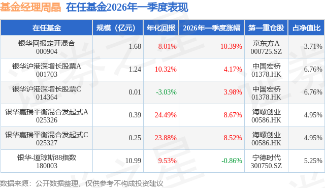从基金规模来看,银华沪港深增长股票A基金2026年一季度公布的基金规模为1.24亿元,较上一期规模1.21亿元变化了292.6万元,环比变化了2.42%。该基金最新一期资产配置为:股票占净值比81.47%,无债券类资产,现金占净值比19.14%。从基金持仓来看,该基金当季前十大股票仓位达33.65%,第一大重仓股为中国宏桥(01378),持仓占比为6.76%。
