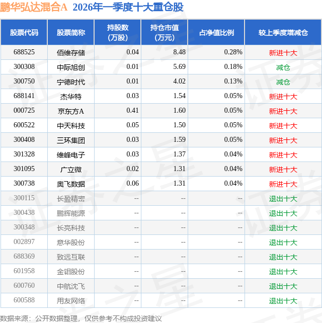 从基金规模来看,鹏华弘达混合A基金2026年一季度公布的基金规模为0.04亿元,较上一期规模222.57万元变化了197.42万元,环比变化了88.7%。该基金最新一期资产配置为:股票占净值比2.87%,债券占净值比110.48%,现金占净值比2.65%。从基金持仓来看,该基金当季前十大股票仓位达0.91%,第一大重仓股为佰维存储(688525),持仓占比为0.28%。