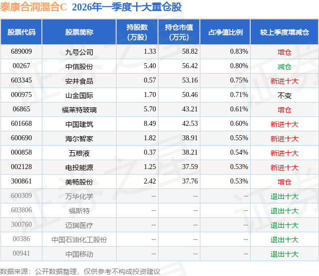 证券之星消息,日前泰康合润混合C基金公布一季报,2026年一季度最新规模0.11亿元,季度净值涨幅为-0.15%。