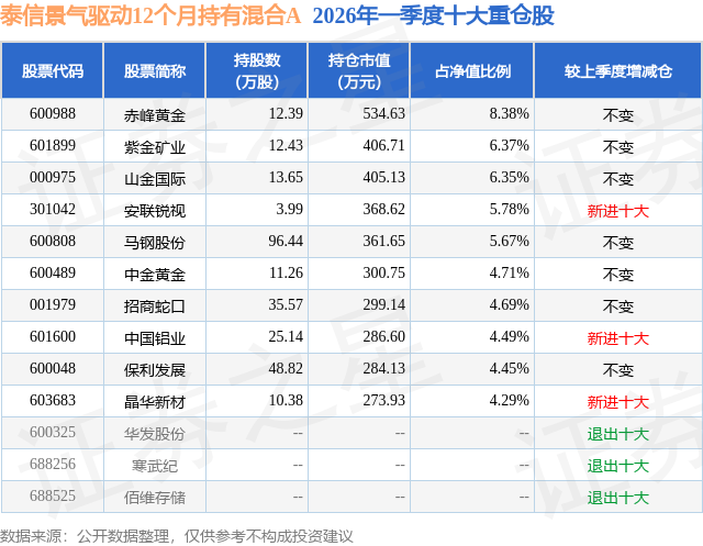 从基金规模来看,泰信景气驱动12个月持有混合A基金2026年一季度公布的基金规模为0.5亿元,较上一期规模5729.49万元变化了-727.35万元,环比变化了-12.69%。该基金最新一期资产配置为:股票占净值比75.15%,无债券类资产,现金占净值比20.18%。从基金持仓来看,该基金当季前十大股票仓位达55.18%,第一大重仓股为赤峰黄金(600988),持仓占比为8.38%。
