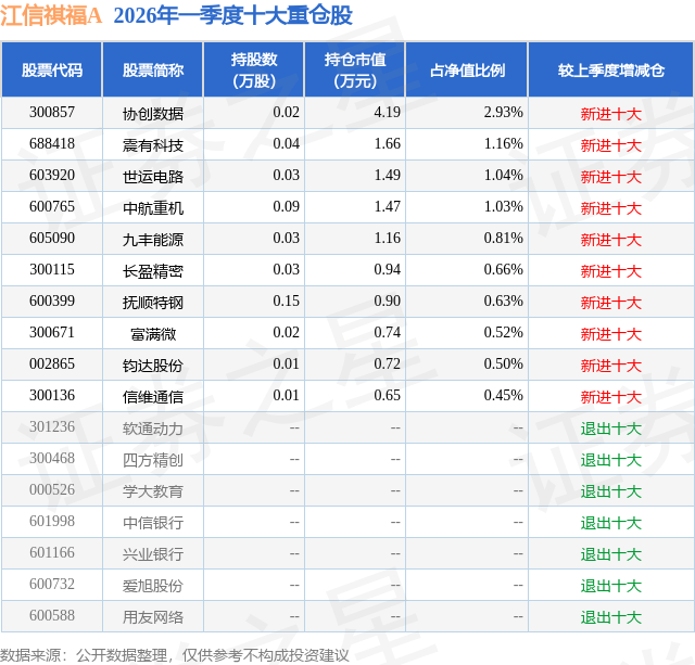 证券之星消息,日前江信祺福A基金公布一季报,2026年一季度最新规模0.01亿元,季度净值涨幅为-0.13%。