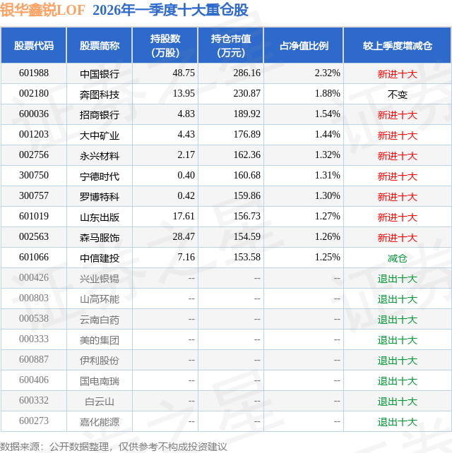 从基金规模来看,银华鑫锐LOF基金2026年一季度公布的基金规模为1.2亿元,较上一期规模10.57亿元变化了-9.38亿元,环比变化了-88.68%。该基金最新一期资产配置为:股票占净值比83.82%,债券占净值比2.7%,现金占净值比12.9%。从基金持仓来看,该基金当季前十大股票仓位达14.89%,第一大重仓股为中国银行(601988),持仓占比为2.32%。