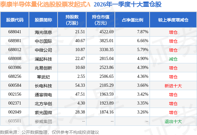 从基金规模来看,泰康半导体量化选股股票发起式A基金2026年一季度公布的基金规模为3.75亿元,较上一期规模8646.81万元变化了2.88亿元,环比变化了333.46%。该基金最新一期资产配置为:股票占净值比94.95%,无债券类资产,现金占净值比5.48%。从基金持仓来看,该基金当季前十大股票仓位达47.66%,第一大重仓股为海光信息(688041),持仓占比为7.87%。