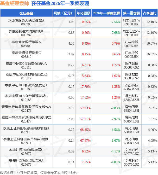 证券之星消息,日前泰康半导体量化选股股票发起式A基金公布一季报,2026年一季度最新规模3.75亿元,季度净值涨幅为-2.83%。