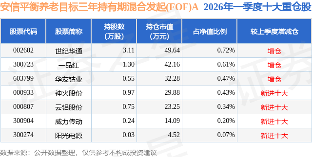 从基金规模来看,安信平衡养老目标三年持有期混合发起(FOF)A基金2026年一季度公布的基金规模为0.69亿元,较上一期规模6098.4万元变化了790.54万元,环比变化了12.96%。该基金最新一期资产配置为:股票占净值比2.84%,债券占净值比5.64%,现金占净值比2.41%。从基金持仓来看,该基金当季前十大股票仓位达2.84%,第一大重仓股为世纪华通(002602),持仓占比为0.72%。