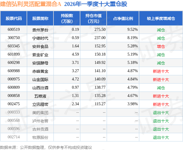 从基金规模来看,建信弘利灵活配置混合A基金2026年一季度公布的基金规模为0.29亿元,较上一期规模4180.12万元变化了-1314.35万元,环比变化了-31.44%。该基金最新一期资产配置为:股票占净值比84.47%,无债券类资产,现金占净值比14.39%。从基金持仓来看,该基金当季前十大股票仓位达56.51%,第一大重仓股为贵州茅台(600519),持仓占比为9.52%。
