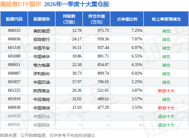 证券之星消息,日前高股息ETF银华基金公布一季报,2026年一季度最新规模1.35亿元,季度净值涨幅为1.19%。