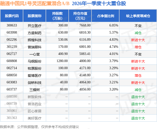 从基金规模来看,融通中国风1号灵活配置混合A/B基金2026年一季度公布的基金规模为12.62亿元,较上一期规模13.58亿元变化了-9637.01万元,环比变化了-7.1%。该基金最新一期资产配置为:股票占净值比94.55%,无债券类资产,现金占净值比6.52%。从基金持仓来看,该基金当季前十大股票仓位达41.76%,第一大重仓股为开立医疗(300633),持仓占比为6.05%。