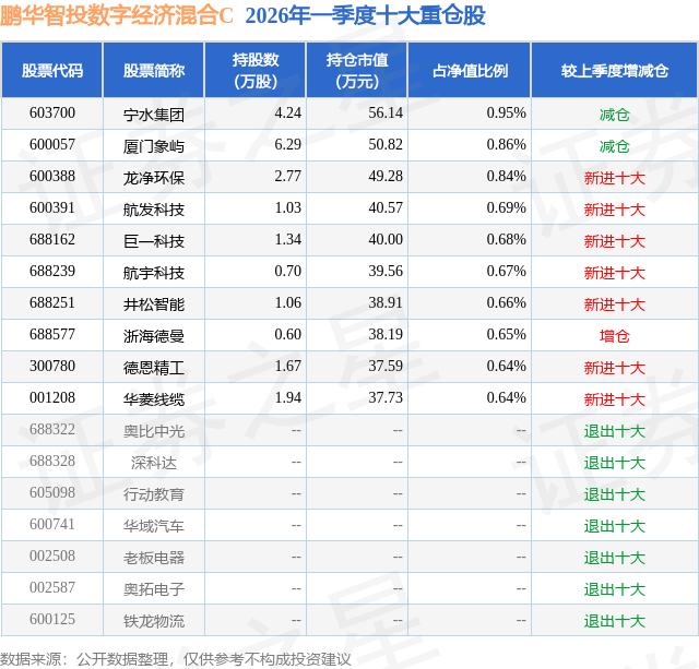 从基金规模来看,鹏华智投数字经济混合C基金2026年一季度公布的基金规模为0.32亿元,较上一期规模1451.84万元变化了1701.18万元,环比变化了117.17%。该基金最新一期资产配置为:股票占净值比89.22%,无债券类资产,现金占净值比11.35%。从基金持仓来看,该基金当季前十大股票仓位达7.28%,第一大重仓股为宁水集团(603700),持仓占比为0.95%。