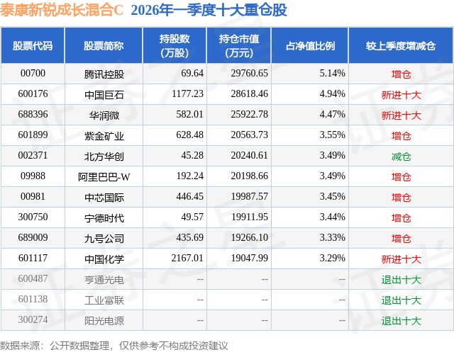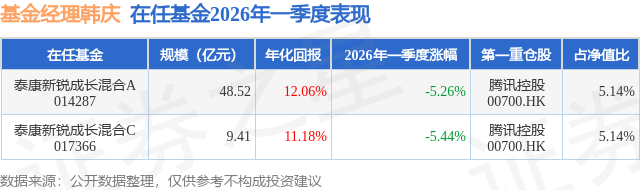 证券之星消息,日前泰康新锐成长混合C基金公布一季报,2026年一季度最新规模9.41亿元,季度净值涨幅为-5.44%。