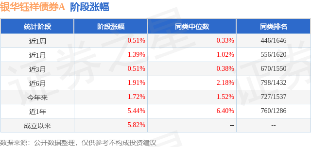 从业绩表现来看,银华钰祥债券A基金过去一年净值涨幅为5.44%,在同类基金中排名760/1286,同类基金过去一年净值涨幅中位数为6.4%。而基金过去一年的最大回撤为-1.94%,成立以来的最大回撤为-1.94%。