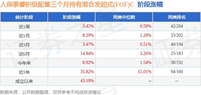 证券之星消息,日前人保泰睿积极配置三个月持有混合发起式(FOF)C基金公布一季报,2026年一季度最新规模0.0亿元,季度净值涨幅为-1.06%。