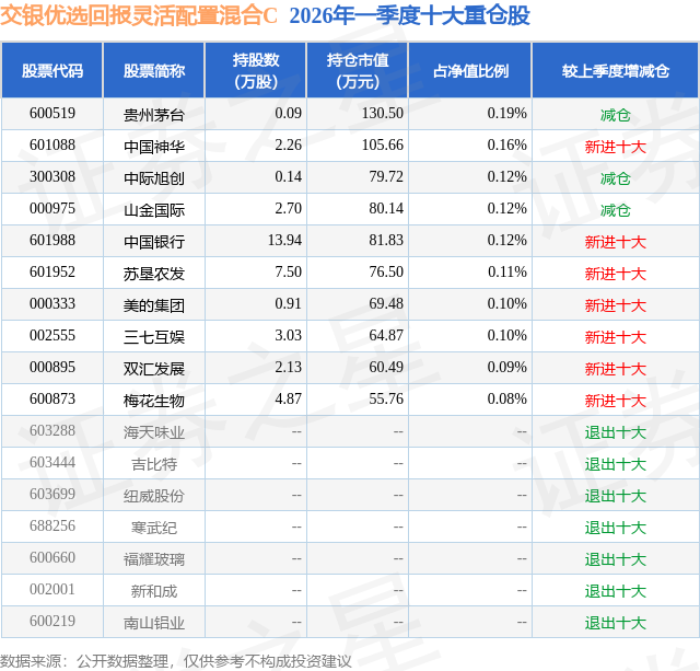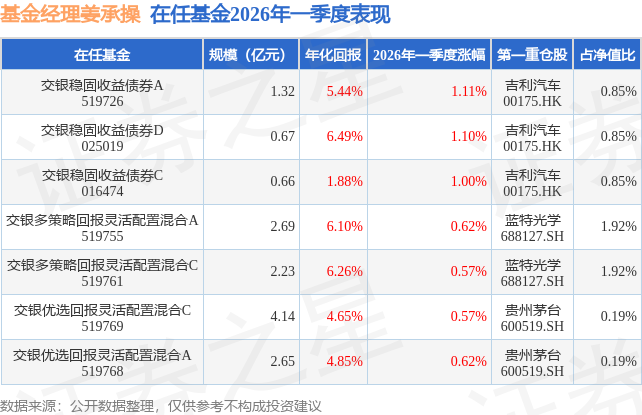 从基金规模来看,交银优选回报灵活配置混合C基金2026年一季度公布的基金规模为4.14亿元,较上一期规模1.02亿元变化了3.12亿元,环比变化了304.69%。该基金最新一期资产配置为:股票占净值比7.11%,债券占净值比96.25%,现金占净值比0.84%。从基金持仓来看,该基金当季前十大股票仓位达1.19%,第一大重仓股为贵州茅台(600519),持仓占比为0.19%。