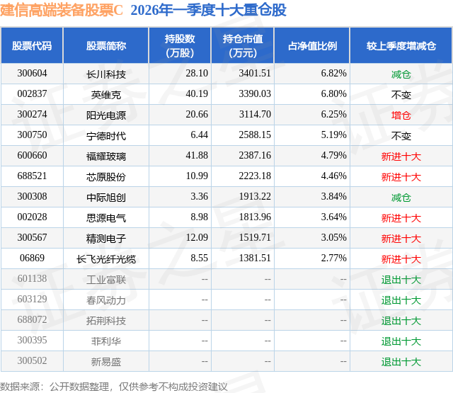 从基金规模来看,建信高端装备股票C基金2026年一季度公布的基金规模为1.2亿元,较上一期规模1.86亿元变化了-6604.42万元,环比变化了-35.56%。该基金最新一期资产配置为:股票占净值比85.21%,无债券类资产,现金占净值比12.36%。从基金持仓来看,该基金当季前十大股票仓位达47.61%,第一大重仓股为长川科技(300604),持仓占比为6.82%。