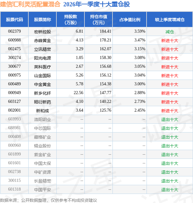 从基金规模来看,建信汇利灵活配置混合基金2026年一季度公布的基金规模为0.51亿元,较上一期规模5096.74万元变化了42.64万元,环比变化了0.84%。该基金最新一期资产配置为:股票占净值比61.29%,无债券类资产,现金占净值比30.22%。从基金持仓来看,该基金当季前十大股票仓位达30.44%,第一大重仓股为宏桥控股(002379),持仓占比为3.59%。