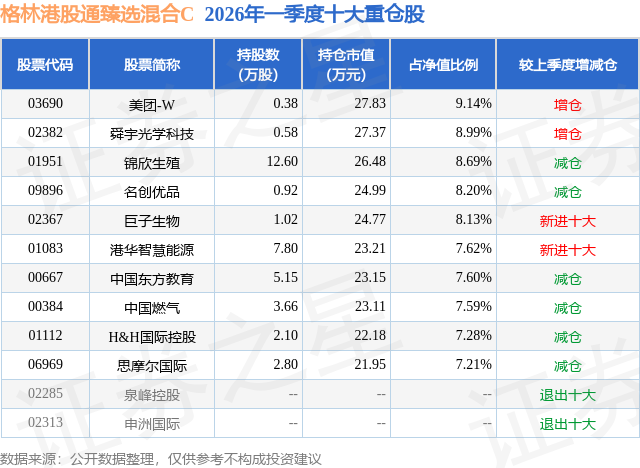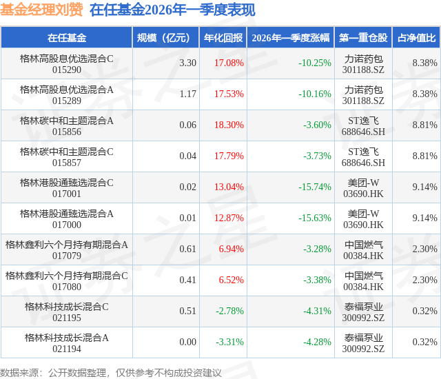 从基金规模来看,格林港股通臻选混合C基金2026年一季度公布的基金规模为0.02亿元,较上一期规模100.22万元变化了67.71万元,环比变化了67.57%。该基金最新一期资产配置为:股票占净值比93.59%,无债券类资产,现金占净值比7.06%。从基金持仓来看,该基金当季前十大股票仓位达80.45%,第一大重仓股为美团-W(03690),持仓占比为9.14%。