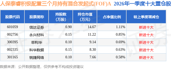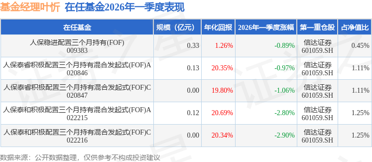 从基金规模来看,人保泰睿积极配置三个月持有混合发起式(FOF)A基金2026年一季度公布的基金规模为0.13亿元,较上一期规模1076.25万元变化了237.96万元,环比变化了22.11%。该基金最新一期资产配置为:股票占净值比3.87%,债券占净值比5.36%,现金占净值比5.73%。从基金持仓来看,该基金当季前十大股票仓位达3.86%,第一大重仓股为信达证券(601059),持仓占比为1.11%。