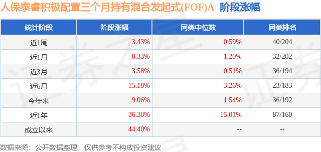 从业绩表现来看,人保泰睿积极配置三个月持有混合发起式(FOF)A基金过去一年净值涨幅为36.38%,在同类基金中排名87/160,同类基金过去一年净值涨幅中位数为15.01%。而基金过去一年的最大回撤为-10.39%,成立以来的最大回撤为-10.39%。