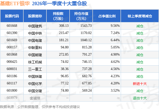 从基金规模来看,基建ETF银华基金2026年一季度公布的基金规模为1.62亿元,较上一期规模2.83亿元变化了-1.21亿元,环比变化了-42.84%。该基金最新一期资产配置为:股票占净值比99.11%,无债券类资产,现金占净值比1.39%。从基金持仓来看,该基金当季前十大股票仓位达54.32%,第一大重仓股为中国建筑(601668),持仓占比为9.56%。