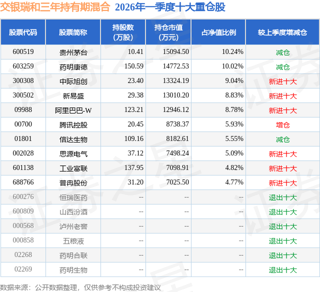 从基金规模来看,交银瑞和三年持有期混合基金2026年一季度公布的基金规模为14.74亿元,较上一期规模29.43亿元变化了-14.69亿元,环比变化了-49.92%。该基金最新一期资产配置为:股票占净值比92.41%,债券占净值比1.61%,现金占净值比6.27%。从基金持仓来看,该基金当季前十大股票仓位达73.07%,第一大重仓股为贵州茅台(600519),持仓占比为10.24%。