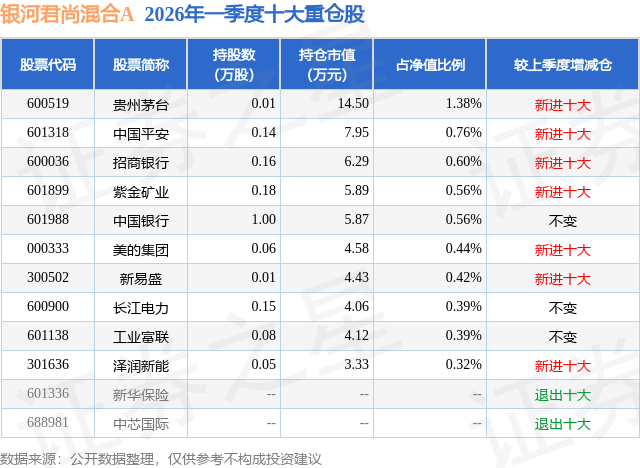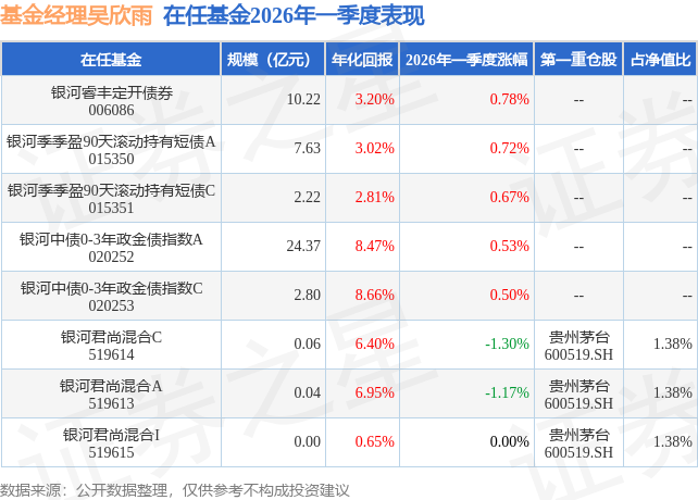 证券之星消息,日前银河君尚混合A基金公布一季报,2026年一季度最新规模0.04亿元,季度净值涨幅为-1.17%。