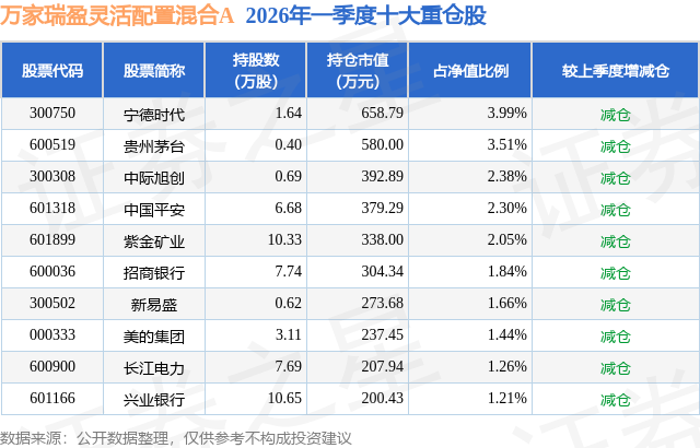 证券之星消息,日前万家瑞盈灵活配置混合A基金公布一季报,2026年一季度最新规模1.37亿元,季度净值涨幅为-3.44%。