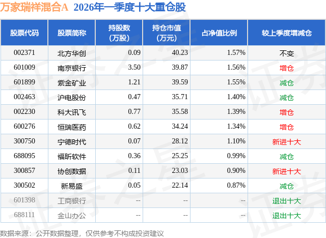 从基金规模来看,万家瑞祥混合A基金2026年一季度公布的基金规模为0.08亿元,较上一期规模1.62亿元变化了-1.55亿元,环比变化了-95.21%。该基金最新一期资产配置为:股票占净值比19.56%,债券占净值比93.14%,现金占净值比3.8%。从基金持仓来看,该基金当季前十大股票仓位达12.67%,第一大重仓股为北方华创(002371),持仓占比为1.57%。