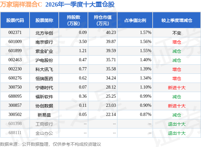 从基金规模来看,万家瑞祥混合C基金2026年一季度公布的基金规模为0.18亿元,较上一期规模2489.32万元变化了-712.15万元,环比变化了-28.61%。该基金最新一期资产配置为:股票占净值比19.56%,债券占净值比93.14%,现金占净值比3.8%。从基金持仓来看,该基金当季前十大股票仓位达12.67%,第一大重仓股为北方华创(002371),持仓占比为1.57%。