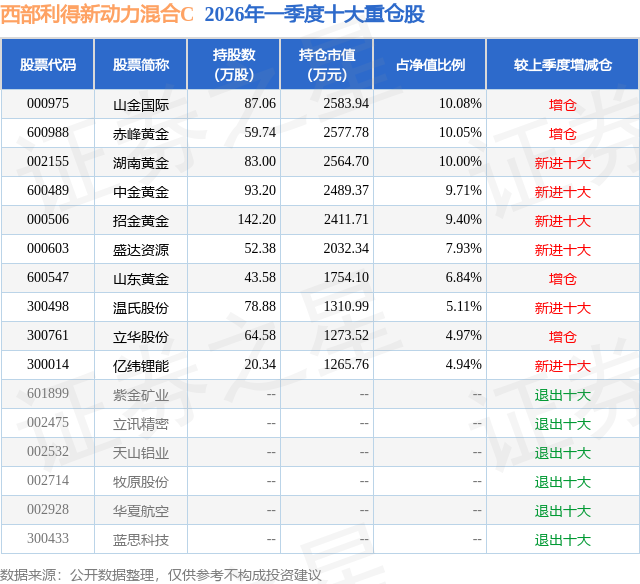 从基金规模来看,西部利得新动力混合C基金2026年一季度公布的基金规模为2.04亿元,较上一期规模1.13亿元变化了9126.1万元,环比变化了80.93%。该基金最新一期资产配置为:股票占净值比93.38%,债券占净值比1.66%,现金占净值比5.46%。从基金持仓来看,该基金当季前十大股票仓位达79.03%,第一大重仓股为山金国际(000975),持仓占比为10.08%。