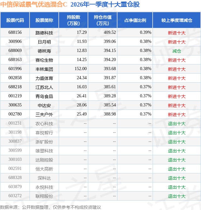 从基金规模来看,中信保诚景气优选混合C基金2026年一季度公布的基金规模为7.98亿元,较上一期规模4481.94万元变化了7.53亿元,环比变化了1680.38%。该基金最新一期资产配置为:股票占净值比78.2%,无债券类资产,现金占净值比7.26%。从基金持仓来看,该基金当季前十大股票仓位达3.77%,第一大重仓股为路德科技(688156),持仓占比为0.39%。