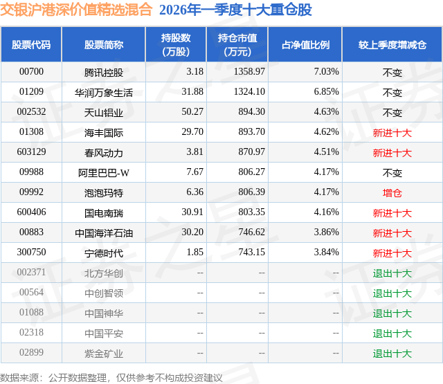 从基金规模来看,交银沪港深价值精选混合基金2026年一季度公布的基金规模为1.93亿元,较上一期规模2.3亿元变化了-3636.54万元,环比变化了-15.83%。该基金最新一期资产配置为:股票占净值比86.44%,无债券类资产,现金占净值比13.99%。从基金持仓来看,该基金当季前十大股票仓位达47.84%,第一大重仓股为腾讯控股(00700),持仓占比为7.03%。